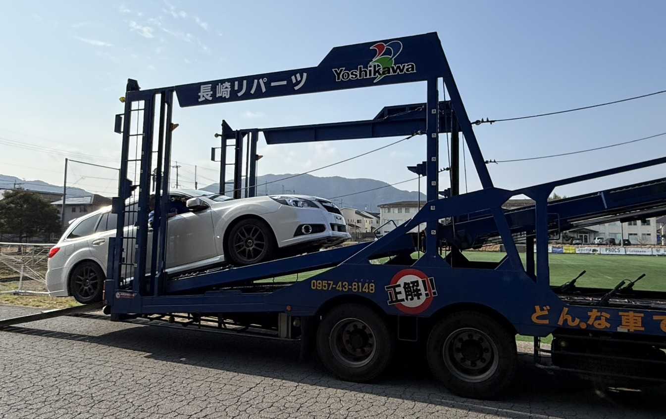 積載車を学校に持ち込んで、車の積み込みを見学してもらいました。